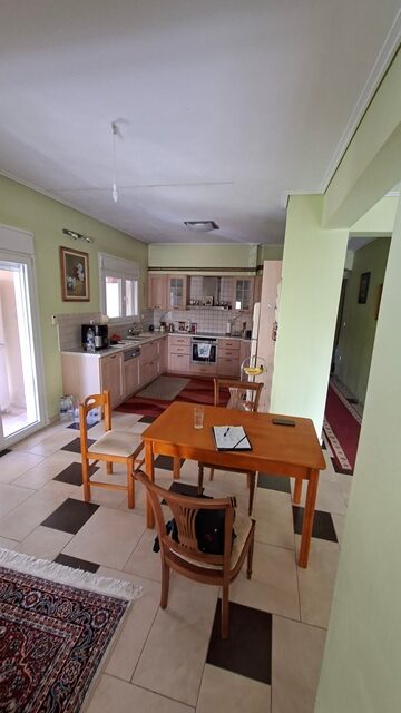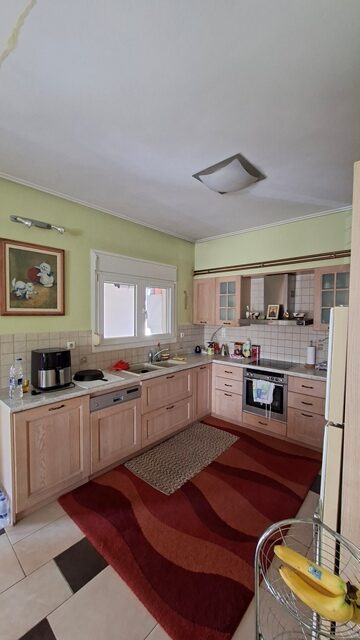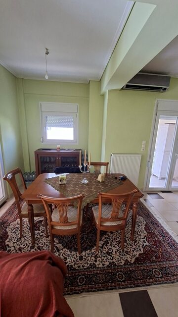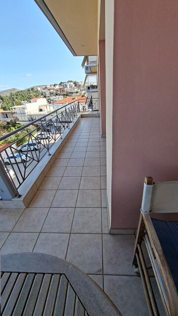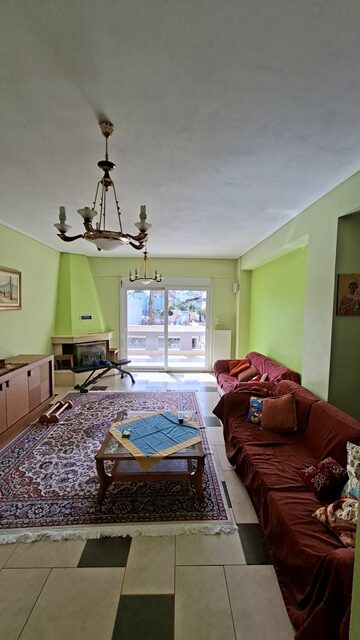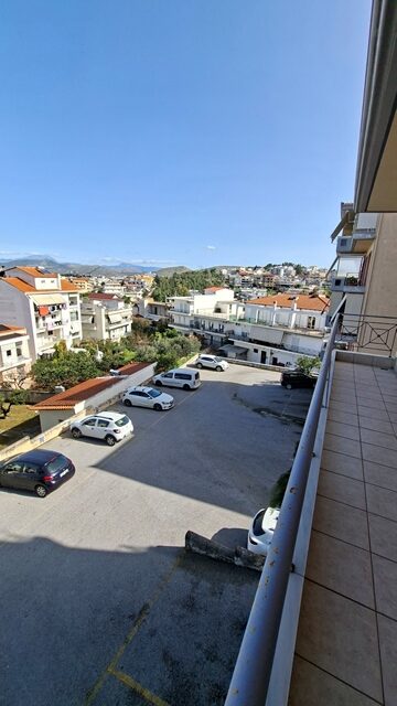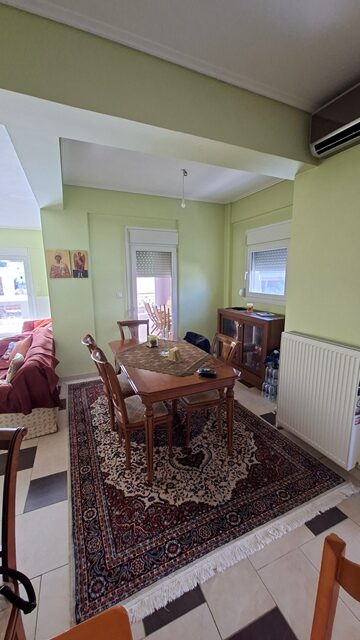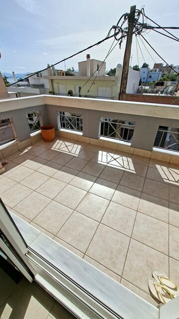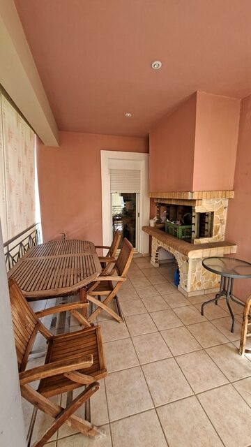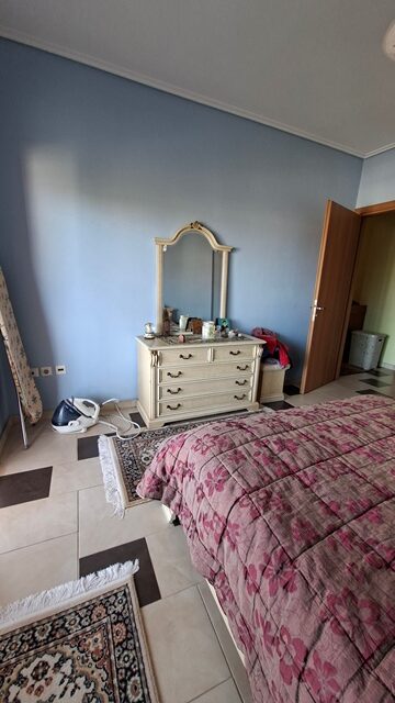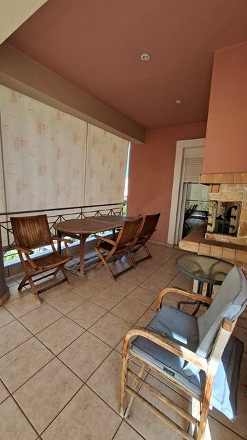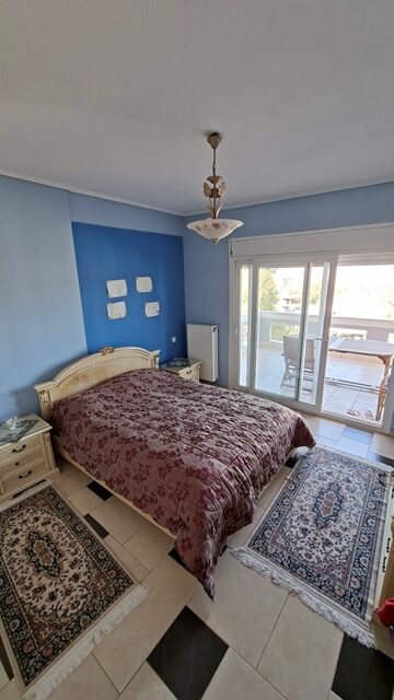 Πωλείται διαμέρισμα 5άρι επιφάνειας 148 τ.μ. 2ου ορόφου, με 4 υπνοδωμάτια, σαλόνι, καθιστικό, χωριστή κουζίνα με εσοχή, 2 μπάνια και αποθήκη. Είναι επιπλωμένο (τραπέζια, καρέκλες, έπιπλα μπαλκονιού και γραφείο) και με ηλεκτρικές συσκευές (2 A/C, πλυντήριο πιάτων). Έχει αυτονομία θέρμανσης με A/C + λέβητα υγραερίου, τζάκι και ηλεκτρικό θερμοσίφωνα. Διαθέτει δάπεδο πλακάκι, παράθυρα αλουμινίου, ηλεκτρικά ρολά, σίτες, μεγάλη βεράντα, τέντες, θωρακισμένη πόρτα, θυρο-τηλέφωνο και DsL-INTERNET. Το διαμέρισμα είναι γωνιακό, διαμπερές και προσφέρει απεριόριστη θέα θάλασσα. Υπάρχει επίσης νυχτερινό και τριφασικό ρεύμα. Η πολυκατοικία διαθέτει ανελκυστήρα, B.B.Q και έχει συνολικά 4 ορόφους. Υπάρχει εξωτερική θέση πάρκινγκ σε ακάλυπτο χώρο. Τα κοινόχρηστα ανέρχονται στα 55€ μηνιαίως.